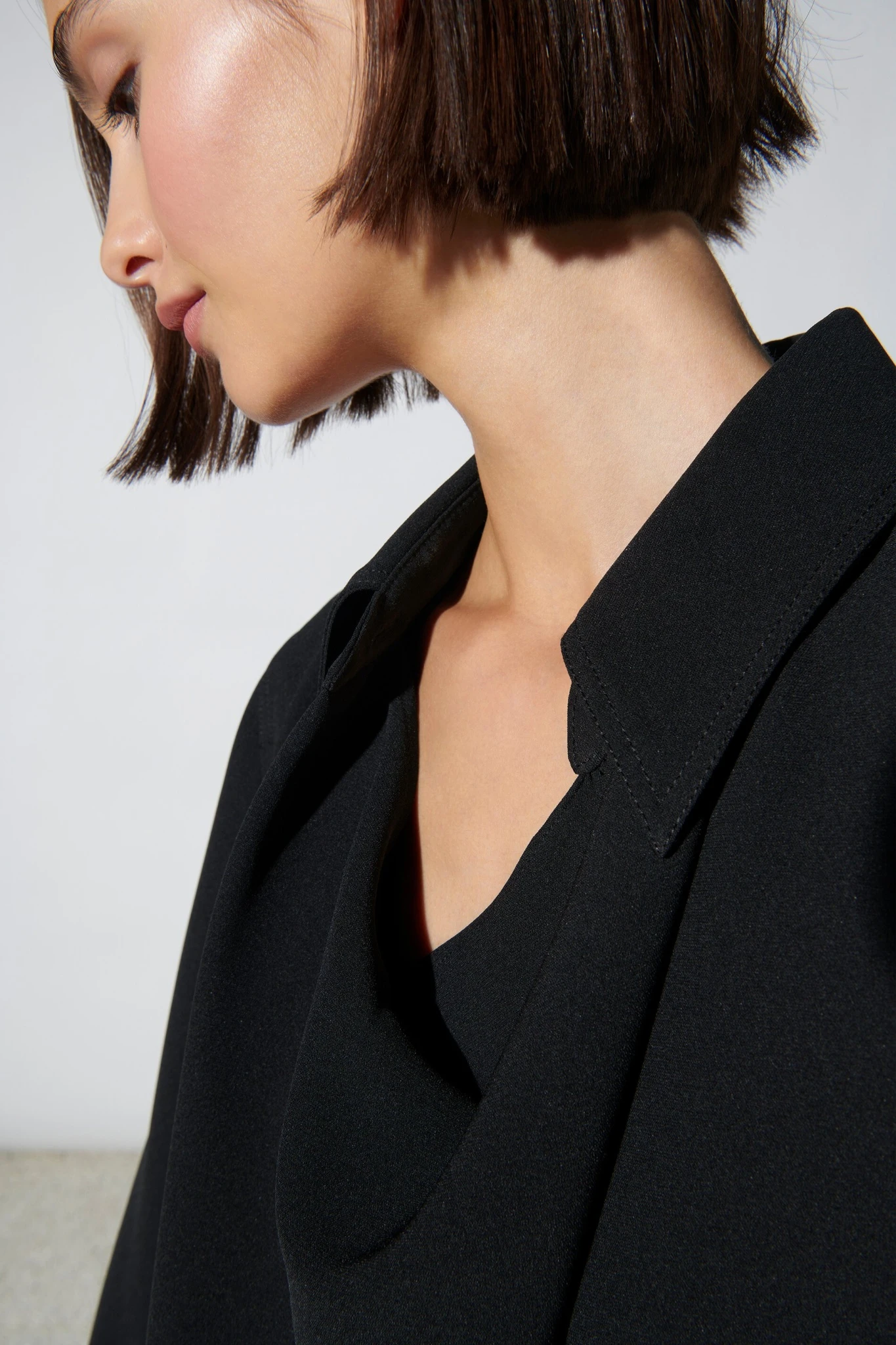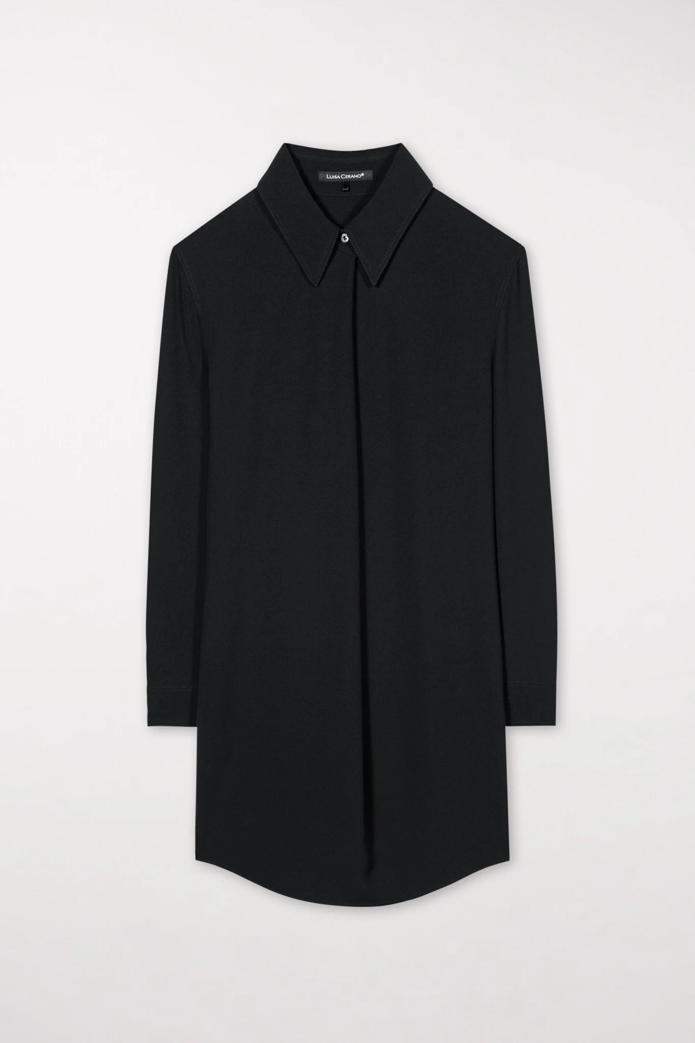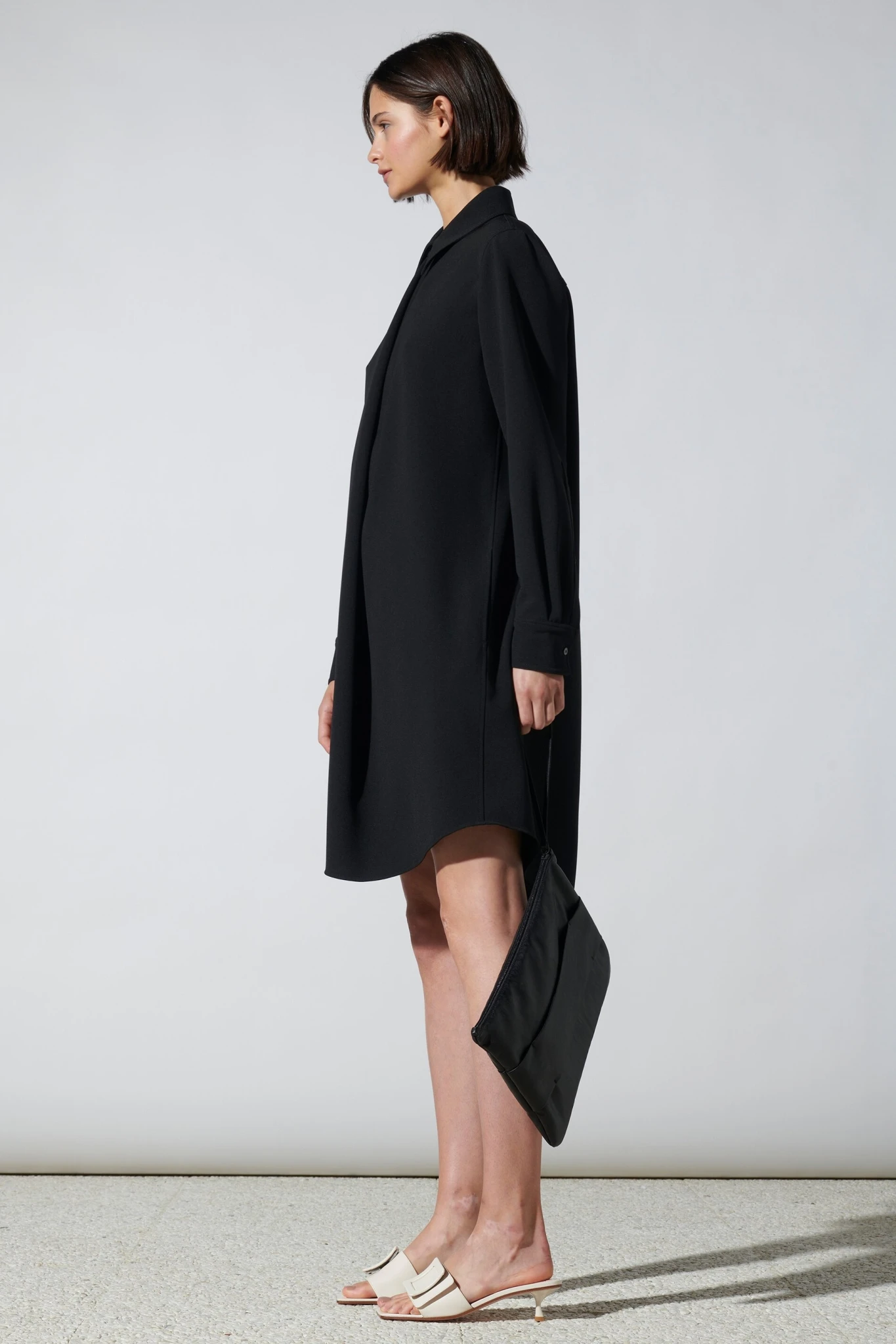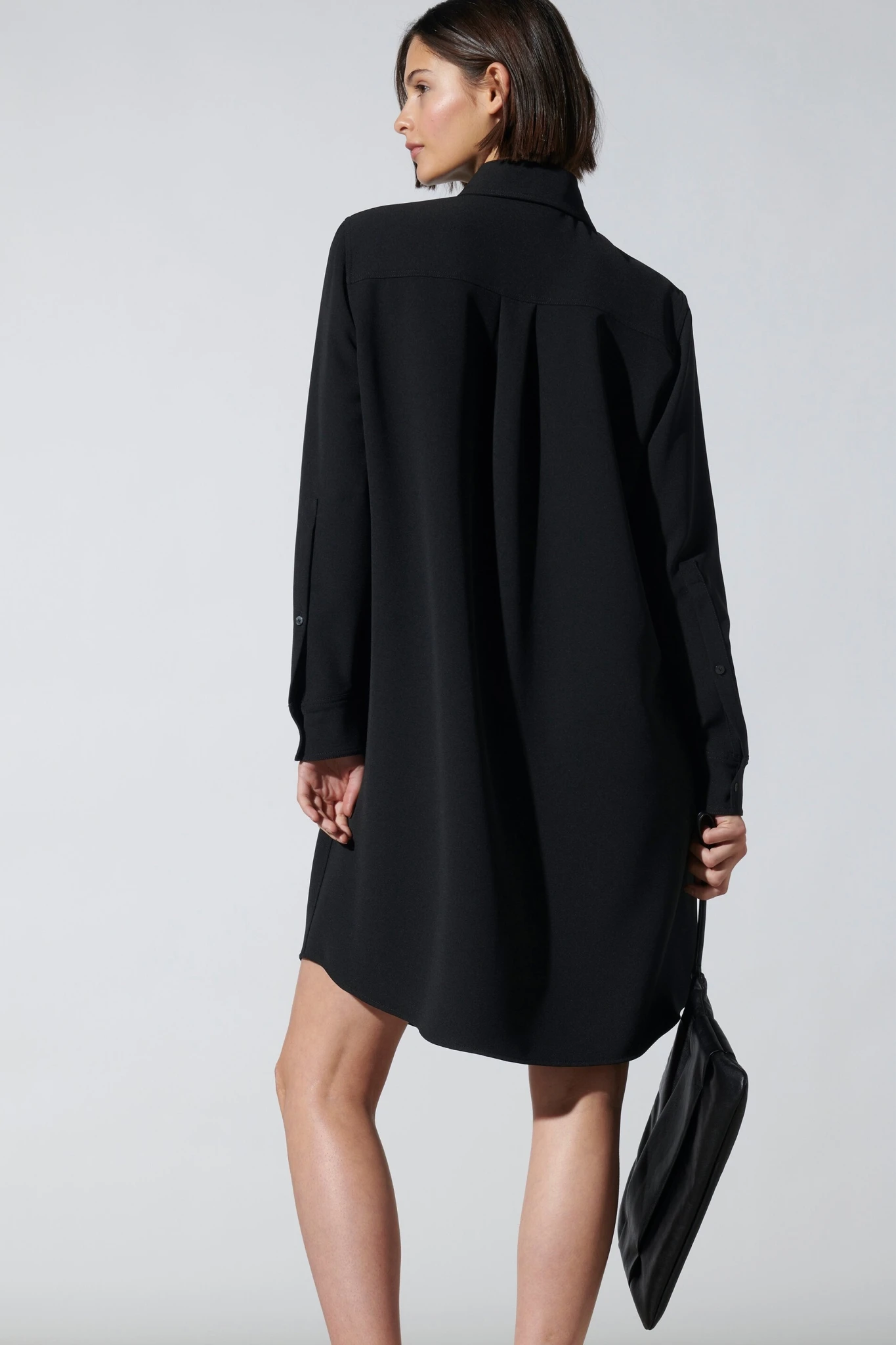 Knielanges Hemdblusenkleid aus fließender Techno-Crêpe-Seide mit langen, hoch geschlitzten und knöpfbaren Ärmeln sowie einem runden Saumabschluss. Das Kleid besitzt zwei Seitentaschen und eine raffinierte Faltenlösung an der Knopfleiste.