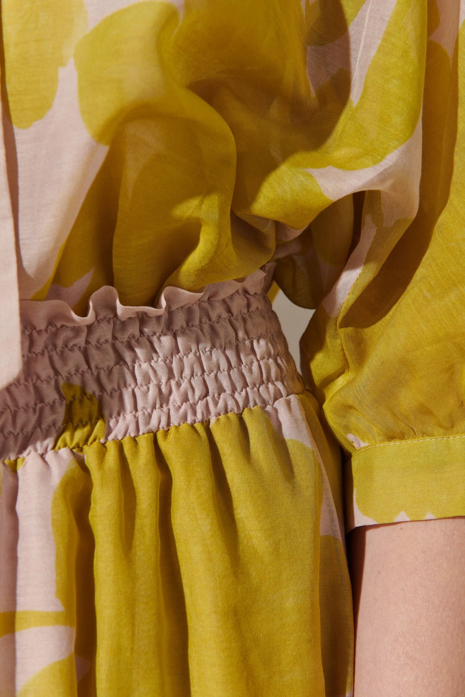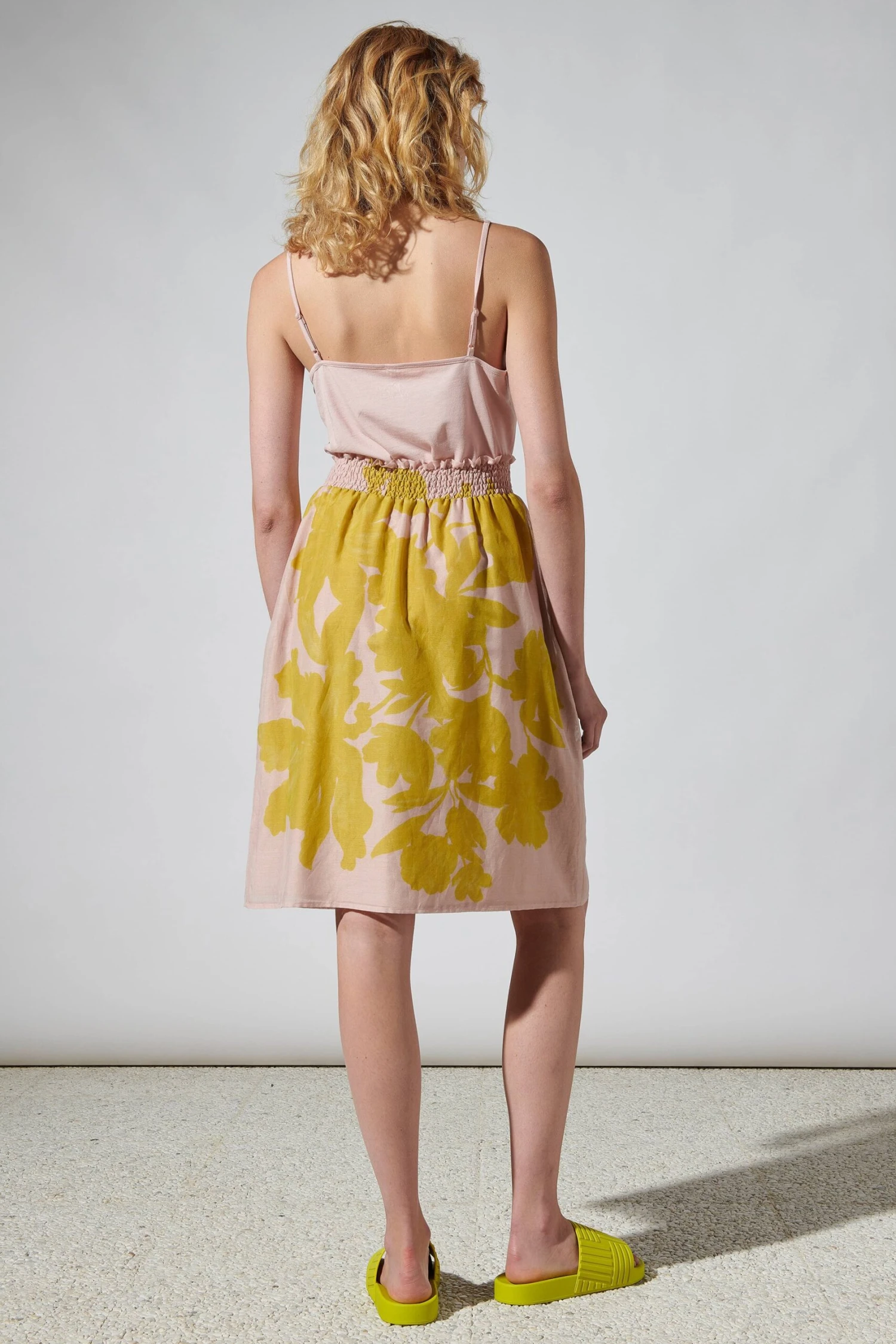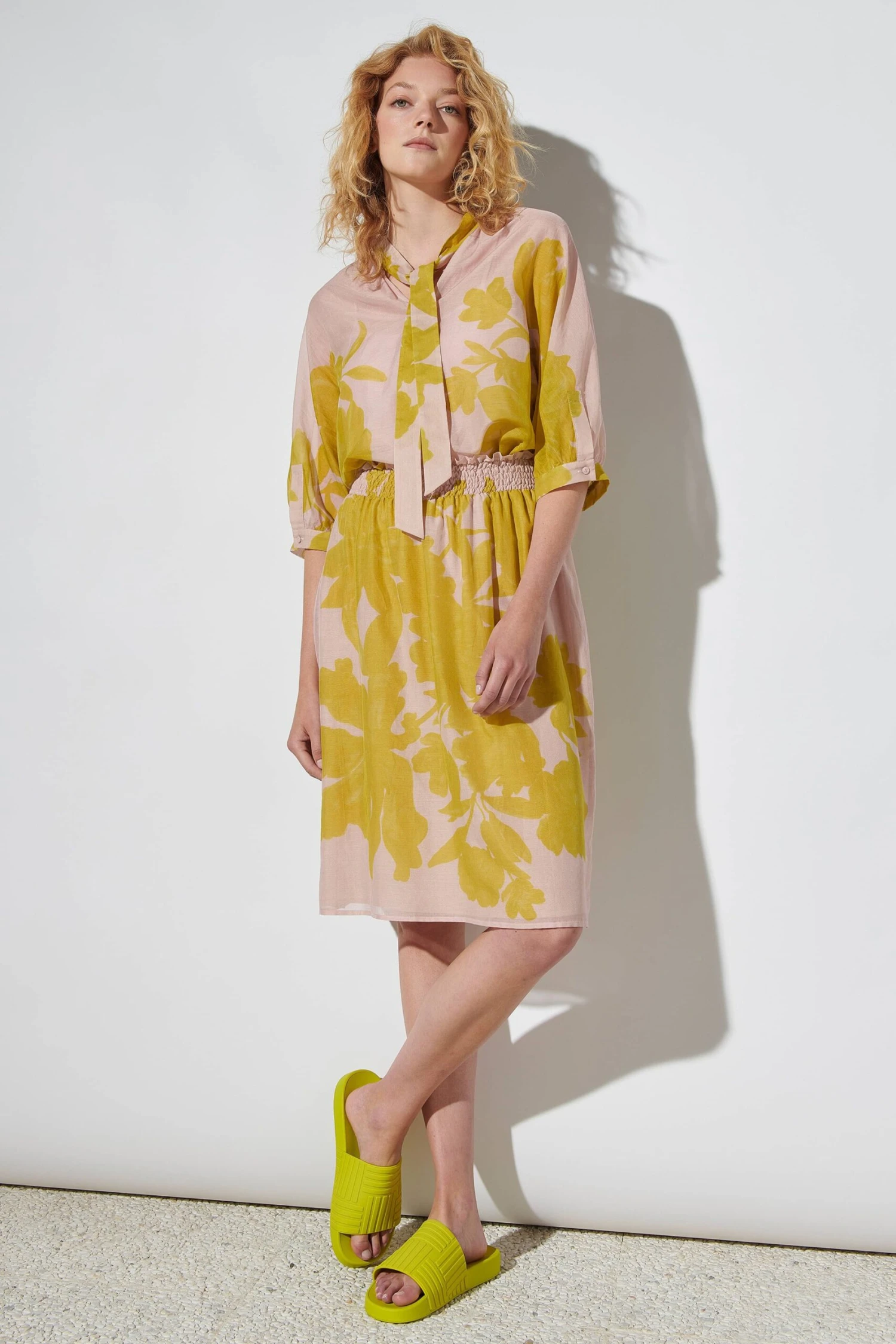 Kurzer, gerade geschnittener Rock aus sommerlichem Baumwoll-Seidenvoile mit exklusivem Blüten-Dessin und gesmoktem Elastikbund. Der Rock ist in weicher Viskosequalität, blickdicht gefüttert.