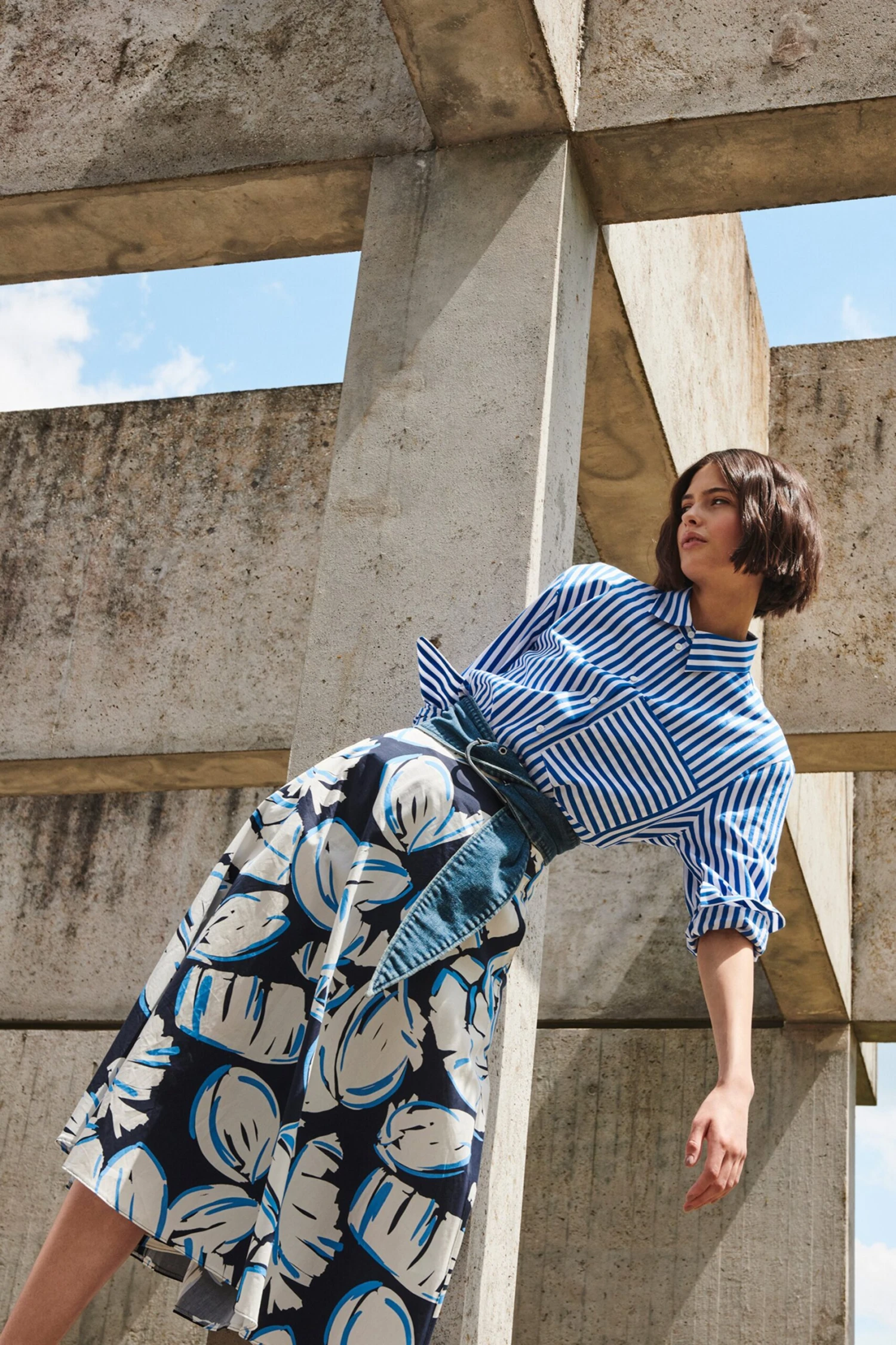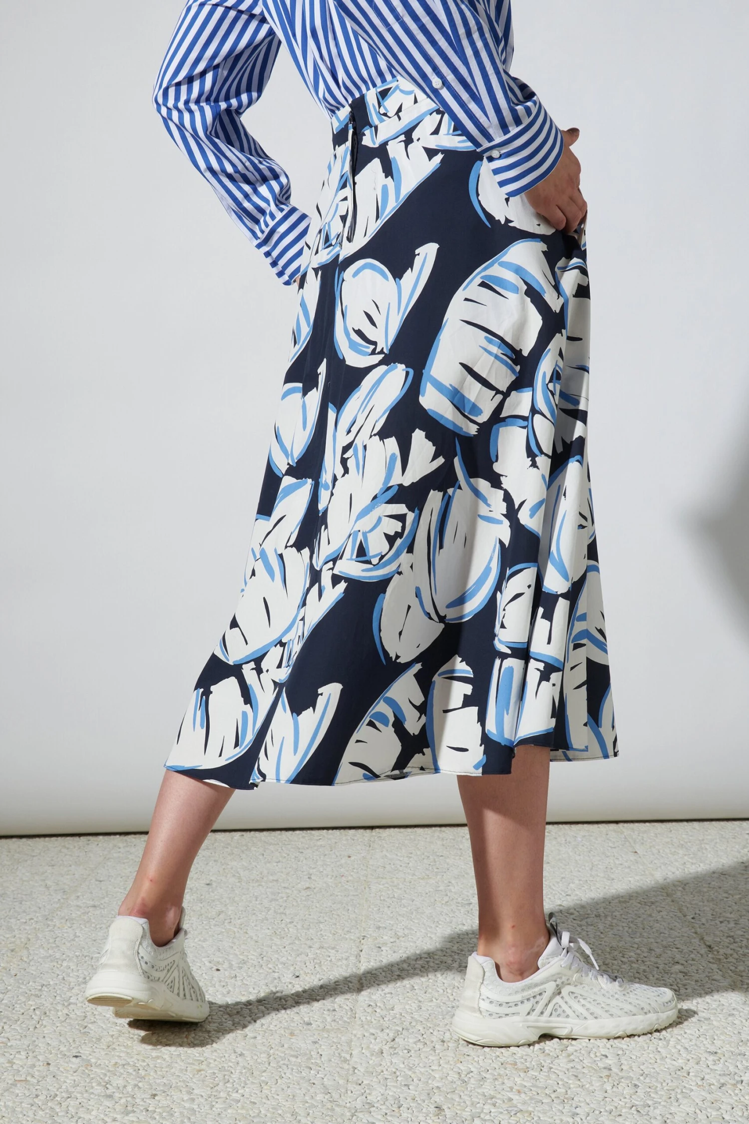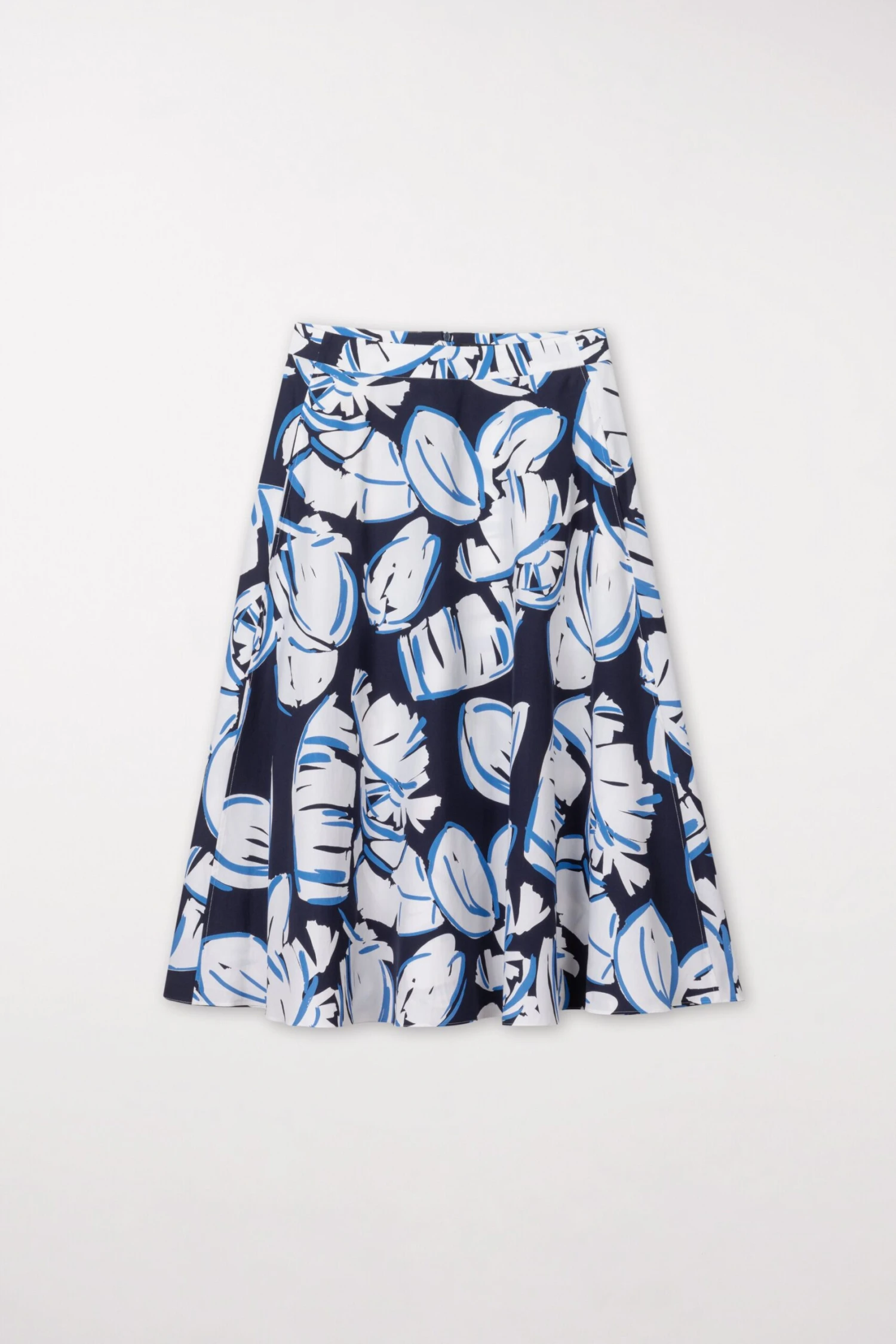 Sommerlicher Midirock in ausgestellter Passform mit Reißverschluss und langen Zippbändchen auf der Rückseite sowie zwei Seitentaschen. Das leichte Baumwoll-Material ist mit einem exklusiven, extrahierten Blätter-Dessin bedruckt.