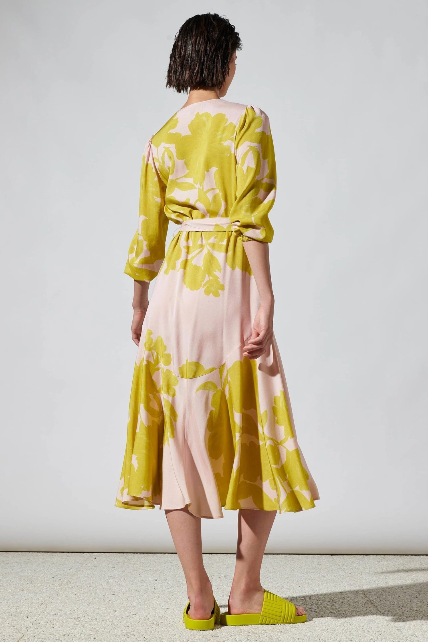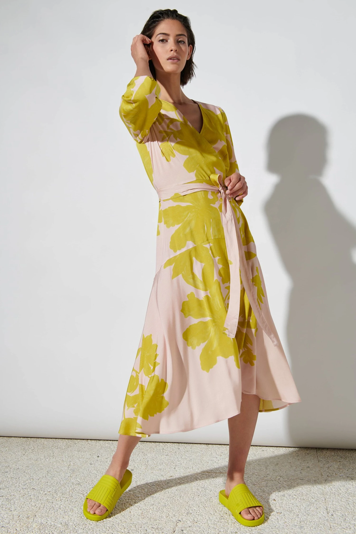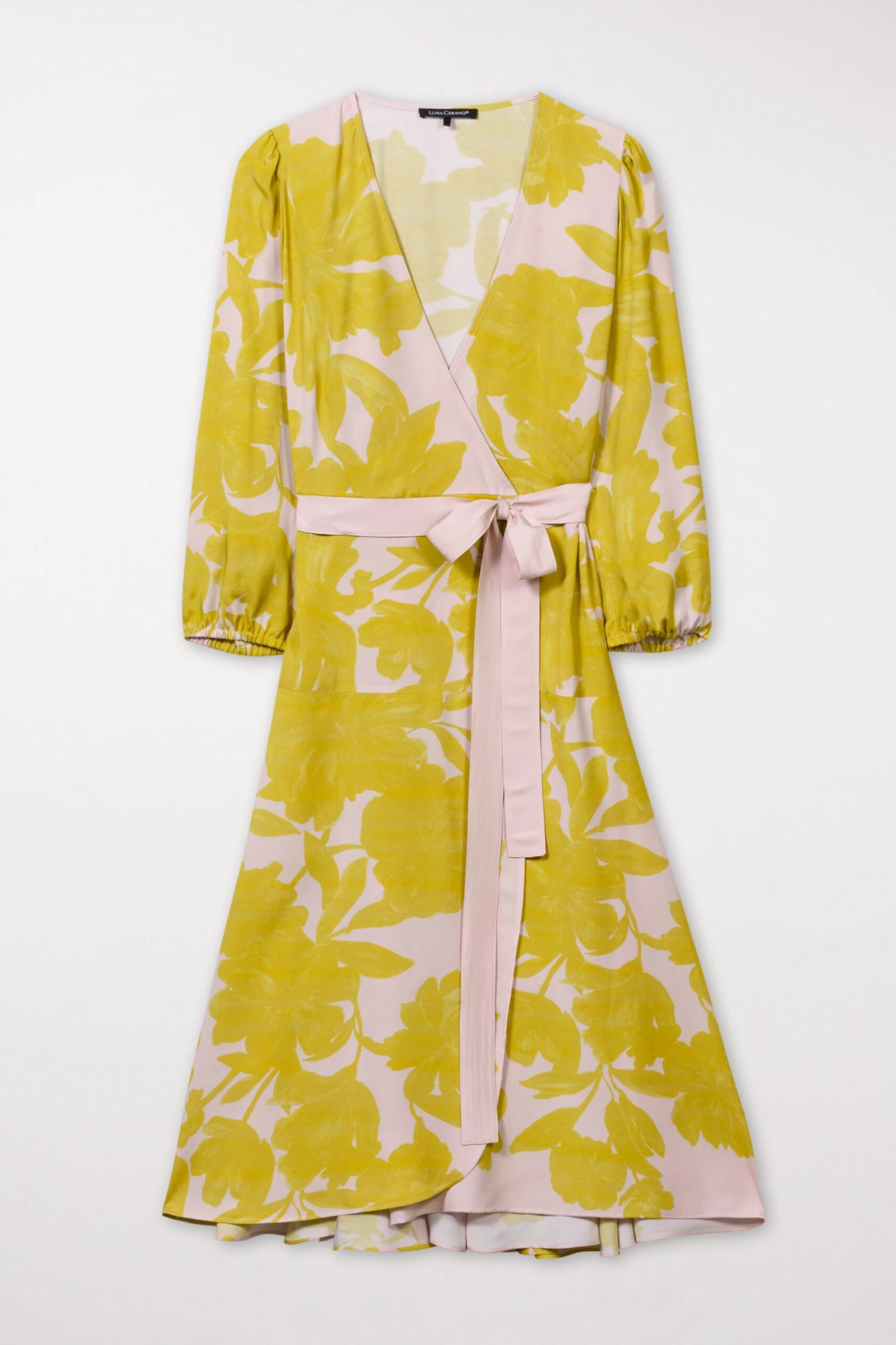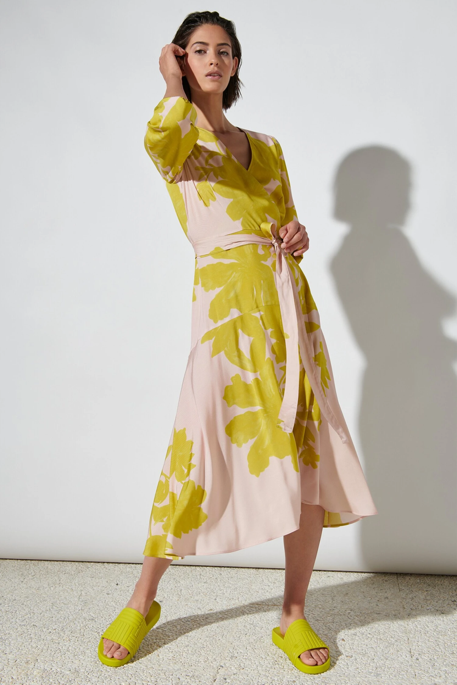 Feminines Wickelkleid aus reiner Viskose mit exklusivem, zweifarbigem Blüten-Dessin und tiefem V-Ausschnitt. Durch den Bindegürtel kann das Kleid in der Taille individuell angepasst werden. Dezente Saumvolants bilden einen schwingenden Abschluss. Unser Model ist 178 cm groß und trägt Größe 36.