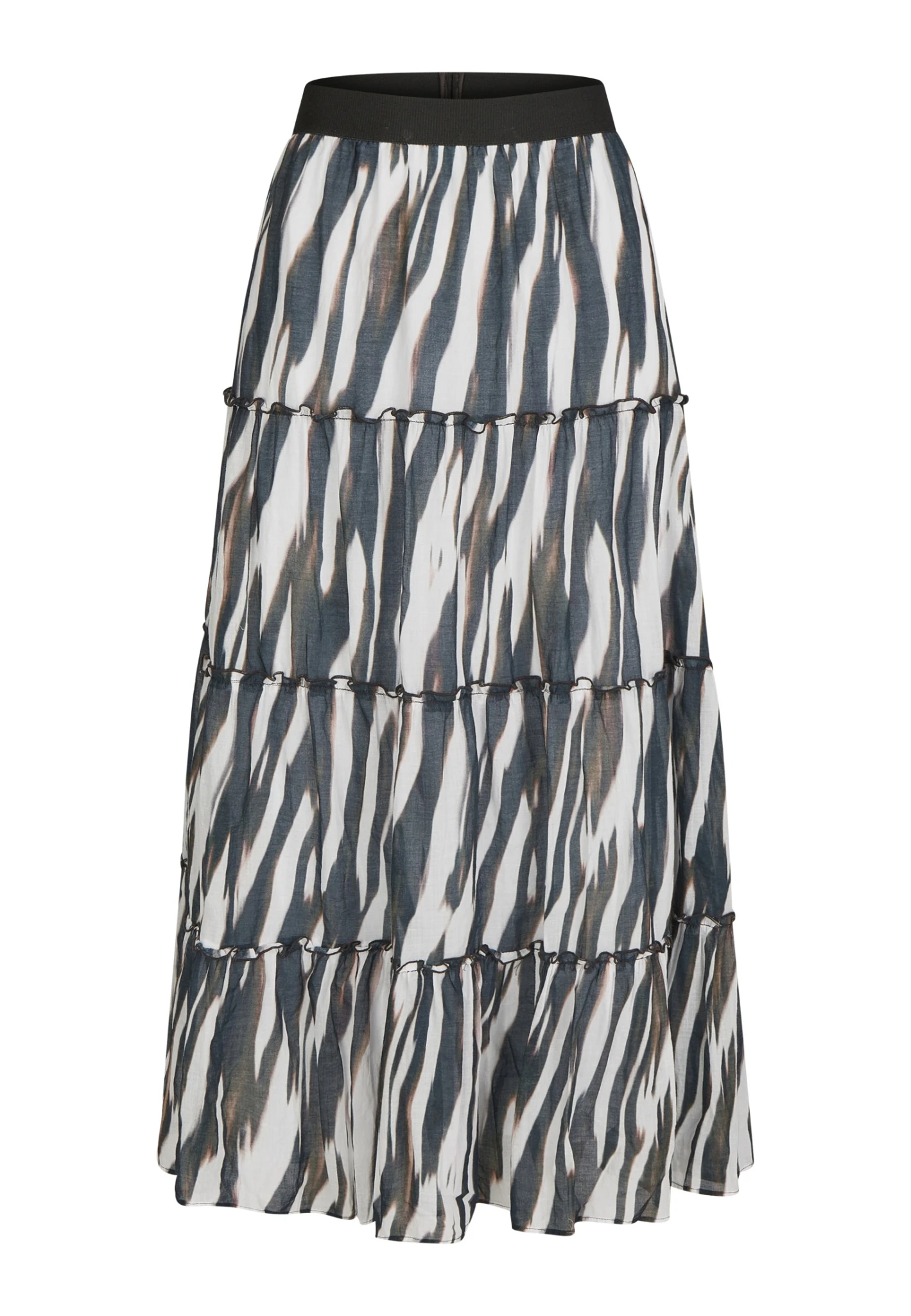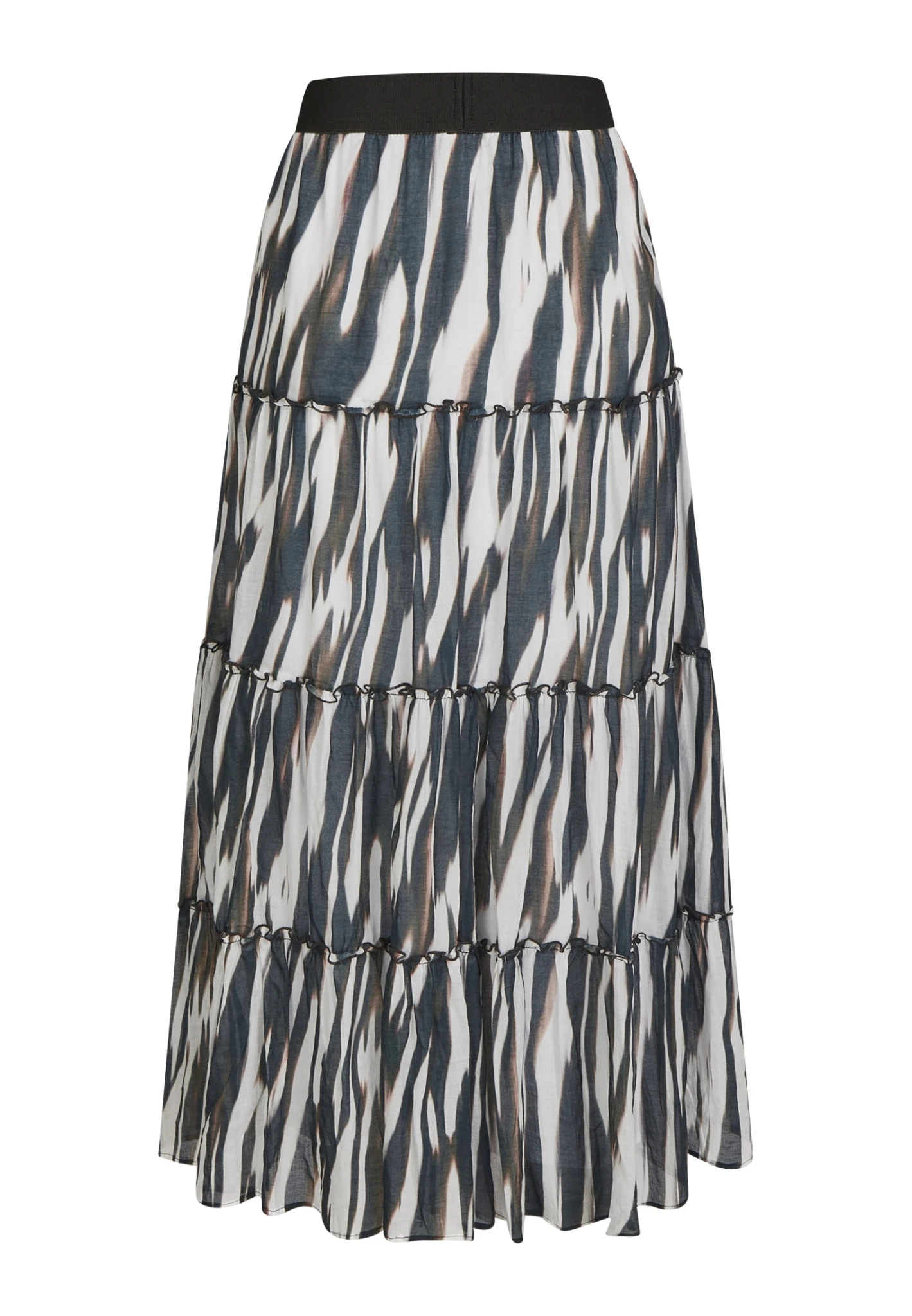 Im modischen Stufenlook kommt dieser Midirock aus edlem Baumwollbatist. Der elastische Gummibund sorgt für einfaches Reinschlüpfen. Der abstrakte Animal-Print macht den Rock zum Eye-Catcher.