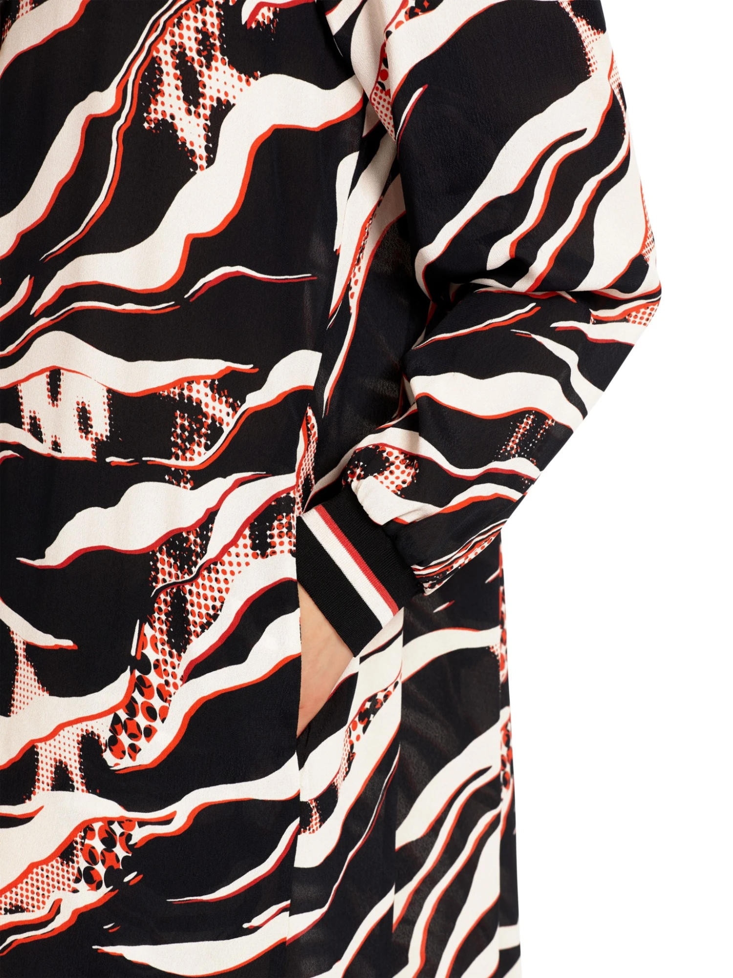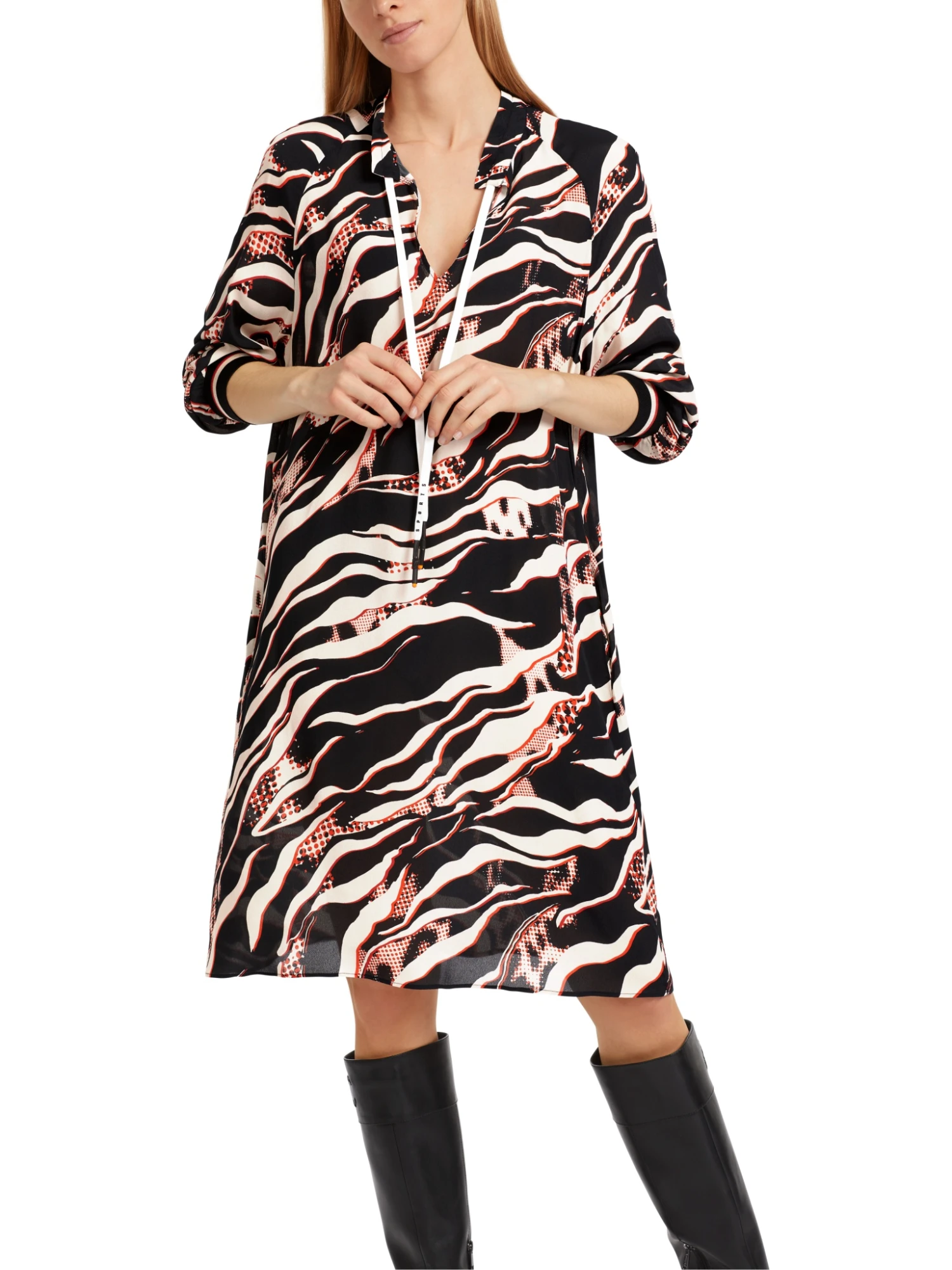 Sportives Kleid aus weichfließender Viskose. Die Silhouette ist durch den Raglanärmel und die A-Linie definiert. Sportive Stilelemente sind das Strickbündchen am Ärmel und das kontrastfarbene Bändchen, mit dem die Kragenweite reguliert werden kann. Funktionelles Detail sind die Taschen in der Seitennaht.