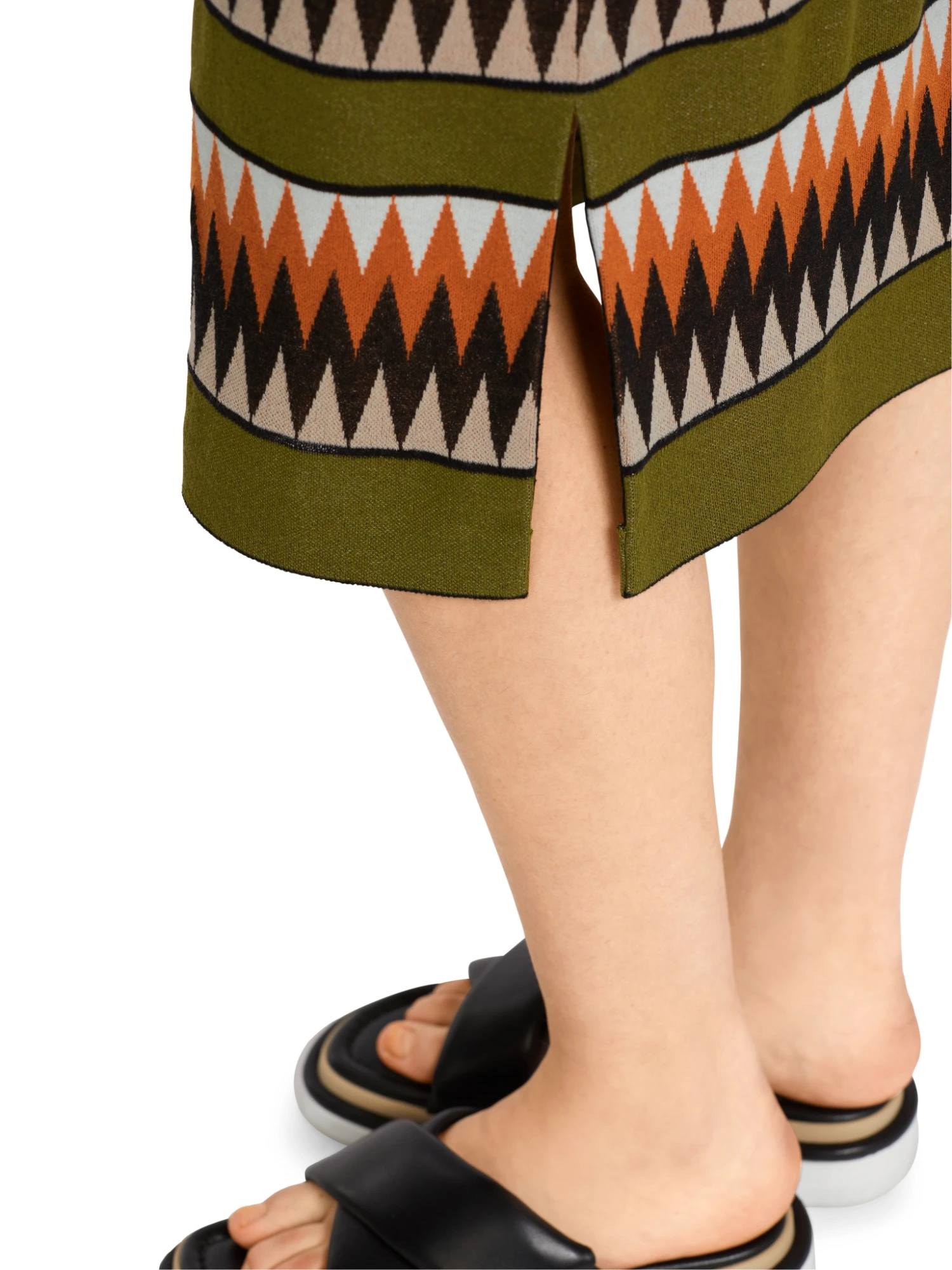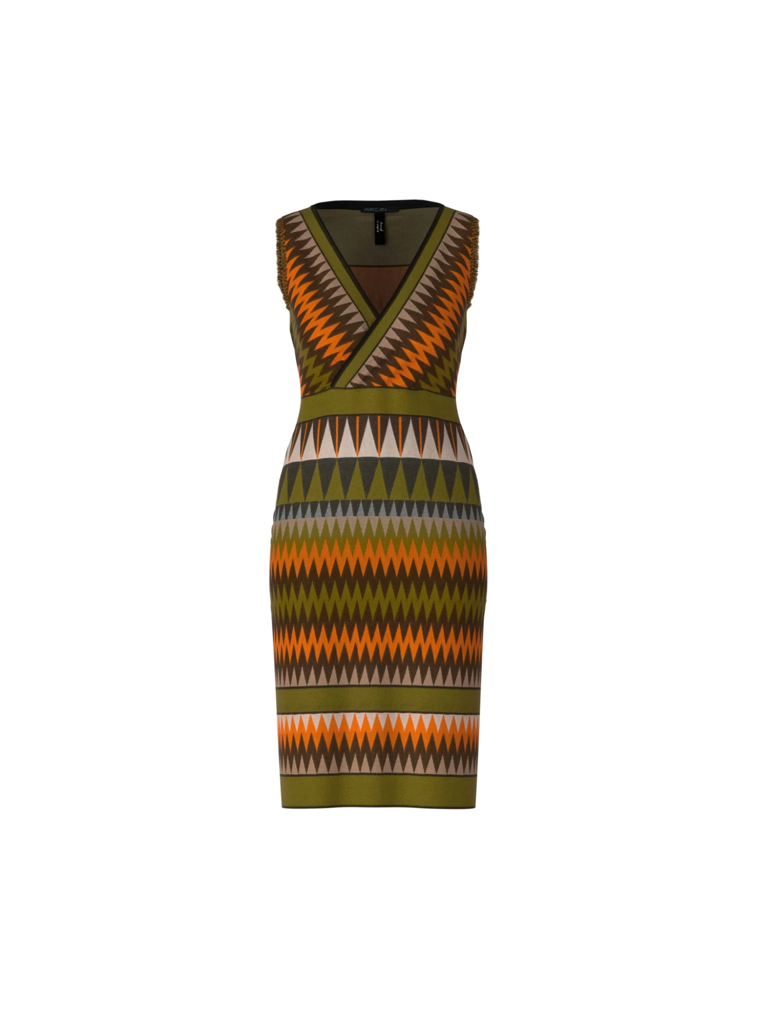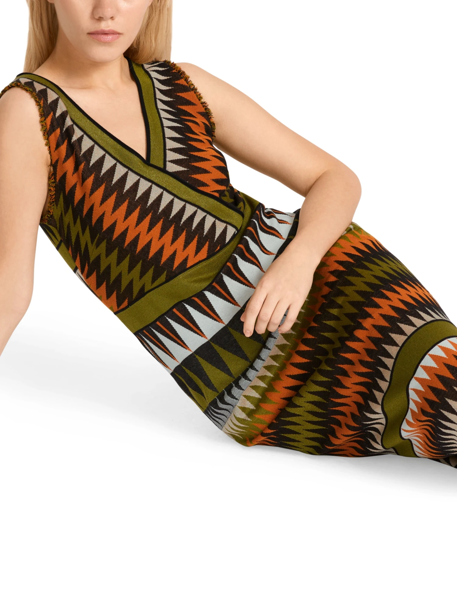 Strickkleid Rethink TogetherDie Farbästhetik erinnert an die Mode der 1970er Jahre und entwickelt in Verbindung mit dem Dessin eine vibrierende Optik. Modelliert ist das körpernahe Kleid durch Abnäher: Vorne sind es Brustabnäher, im Rücken Taillierungsnähte. Im Oberteil findet sich ein Wickeleffekt. Cooles Detail sind die Fransen an den Armausschnitten.