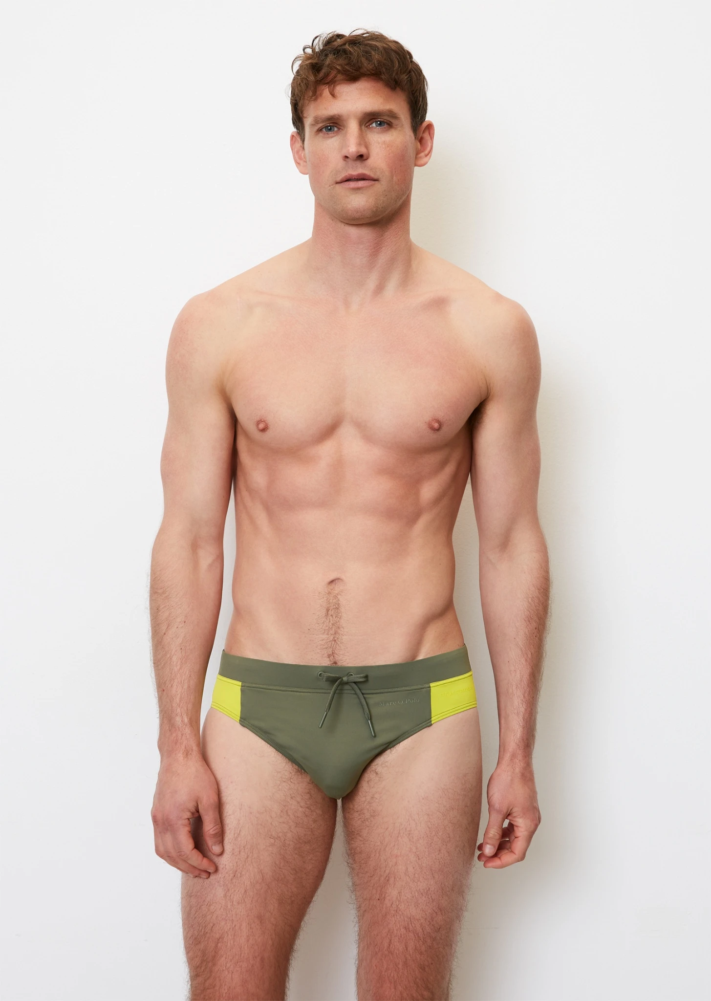Die minimalistischen Badehosen sind aus hochwertigem italienischem Stretch-Stoff geschnitten, mit kontrastierenden seitlichen Panels, breitem elastischem Bund und farblich passenden Accessoires.
