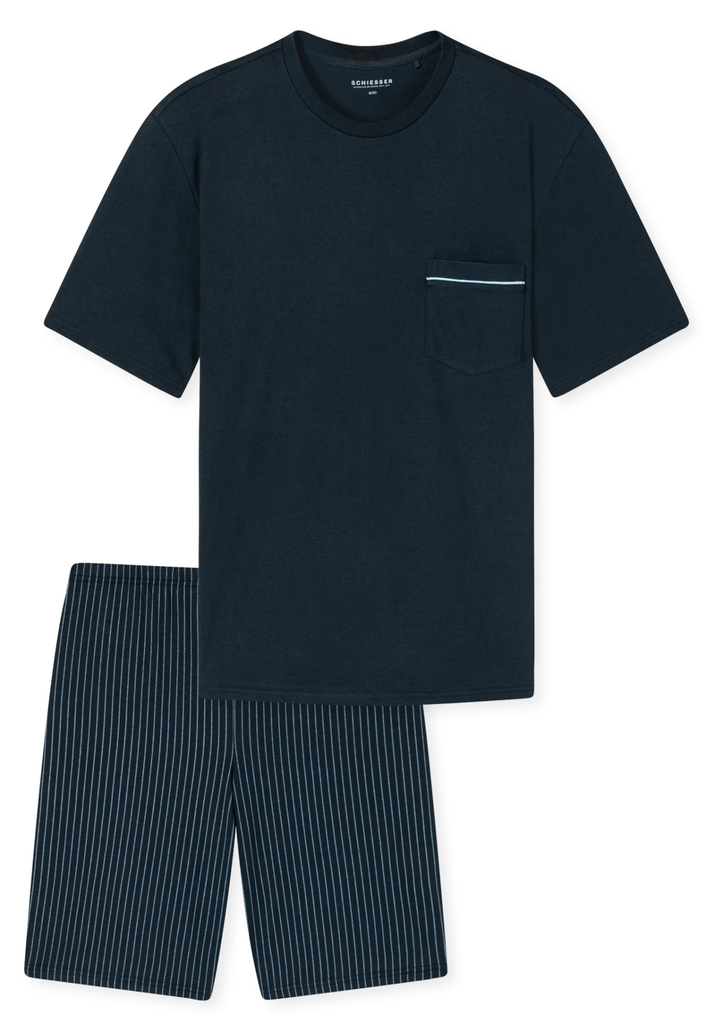 Freuen Sie sich auf einen Herren-Schlafanzug im modischen Design und in softer Single-Jersey-Qualität. Dieser kurze Zweiteiler aus 100 % Baumwolle ist ein echter Hingucker und überzeugt mit höchstem Tragekomfort. Mit der aufgesetzten Brusttasche und dem Rundhalsausschnitt bekommt das unifarbene T-Shirt topaktuelle Details. Die gestreiften Shorts und der bequeme Bund machen das lässige Nachtwäsche-Duo in bester SCHIESSER-Qualität komplett! Auch in großen Größen erhältlich.
